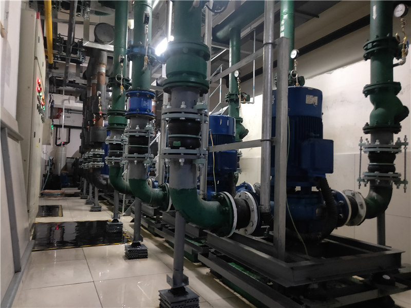 2、进行水泵减振:首先对水泵下面安装减振平台,降低水泵振动。水泵上的管道和进出管道做好弹性支撑,使用软性连接。管道通过墙壁的孔洞处填充吸隔音材料。
